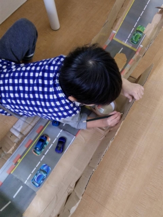 好きな車を貼り付けたり遊びを展開しながら遊ぶ姿が見られました♫途中で興味をもった児童は、元々あった作品にプラスして旗を作ったりイメージを膨らませていましたよ〜☺