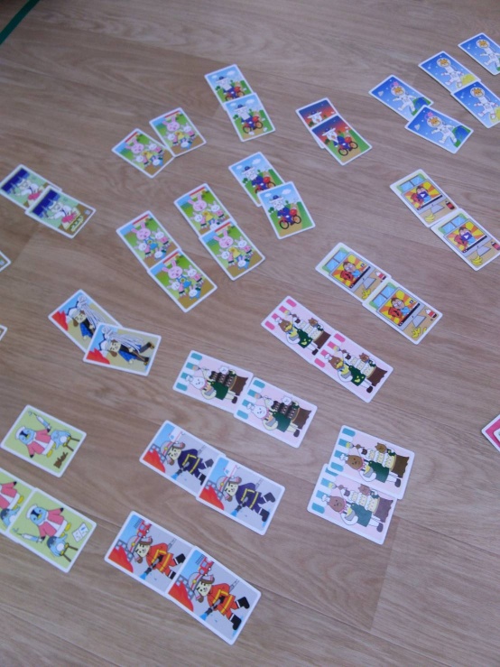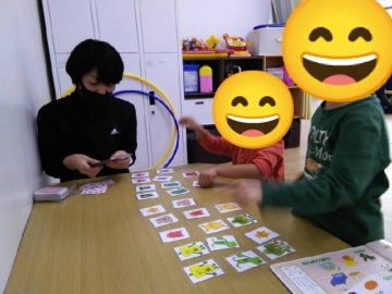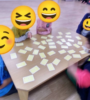 就学児グループです。就学児は、神経衰弱を行っております。こちらは、ルールも細かく設定しているため、難易度は高めですが、真剣に取り組み集中して頑張っていました。