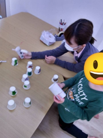 また、本日の微細運動は「的当ての『的作成』」です。こちらは、見本を観ながら制作している様子です。一人3個ずつを目標に作成しました。たくさんの的が出来ましたね!