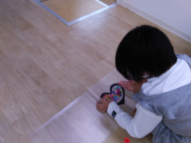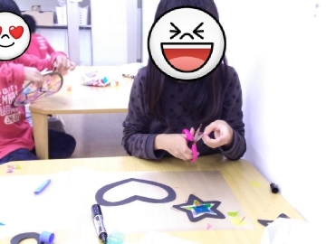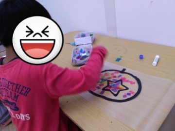 「のりがうまくくっつかない〜!」とイライラする場面もありましたが、スタッフが一緒にはりつけをして「なおせるし、落ちついてやれば大丈夫だよ」と伝えると、楽しくなってきたようで、集中して、とてもきれいなデザインのステンドグラスを作成していました(*^^*)