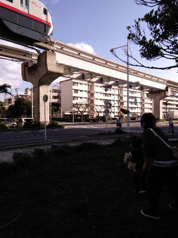 モノレールに元気よく手を振っています♫近くで見れるので迫力が満点でしたよ!
