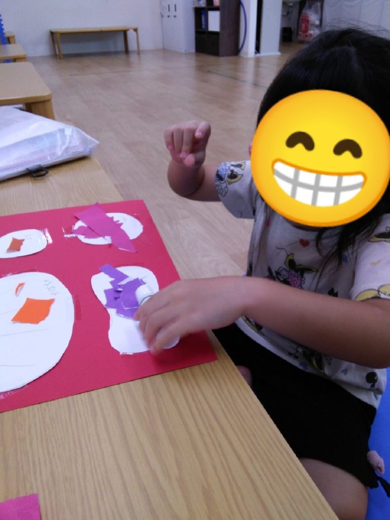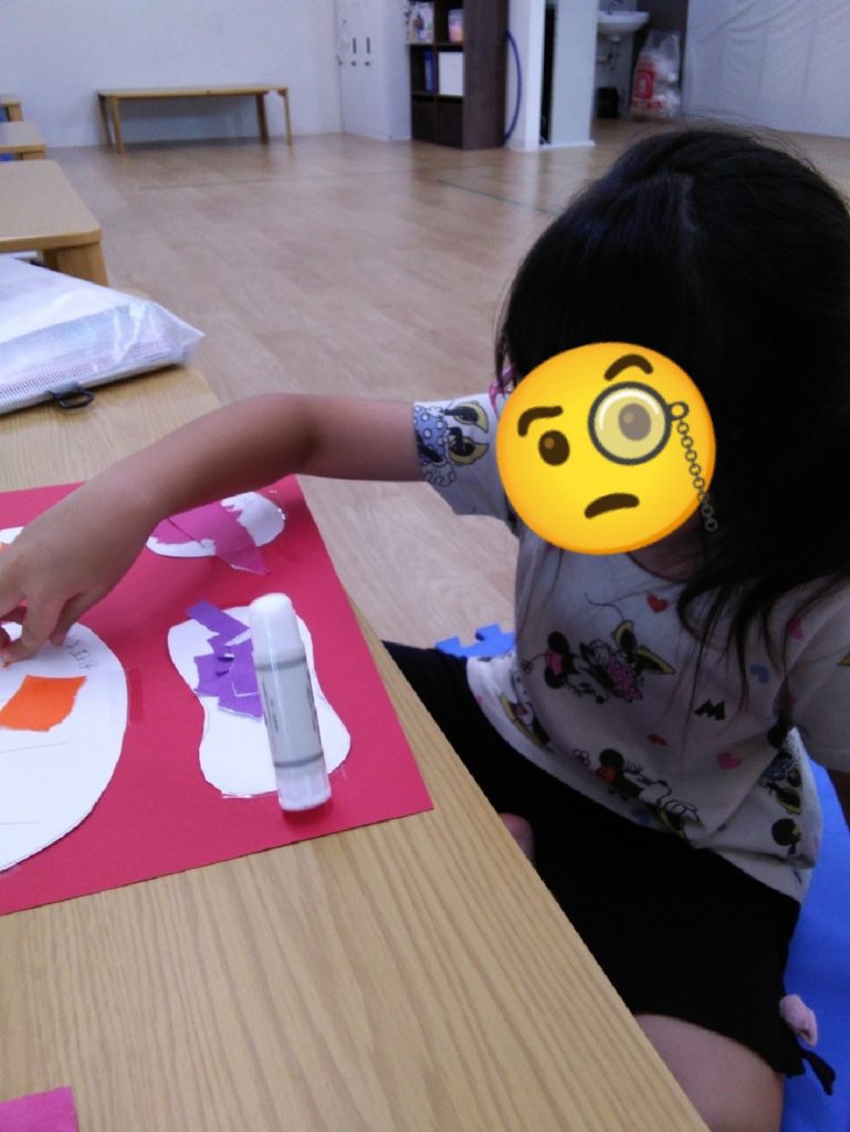 絵や色を理解し、折り紙をちぎってノリでペタペタ~(^^♪