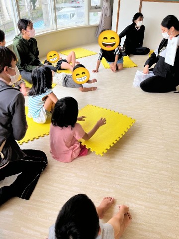 未就学児は、読み聞かせにリズム遊びを行い本日も元気いっぱいです!!マットを活用することで離席も減り座れる時間も少しずつ長くなってきていますよ♫