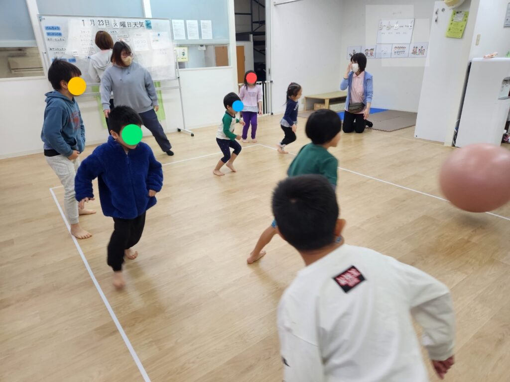 最初にボールに当たってしまい悔しさのあまりその場から離れてしまう児童もいましたが、スタッフに悔しい気持ちを受け入れてもらうことでそれ以降は笑顔で過ごしてくれました♪