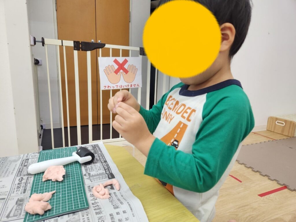 「こねこね」「くるくる」と言葉を真似ながら粘土の感覚を楽しんだり