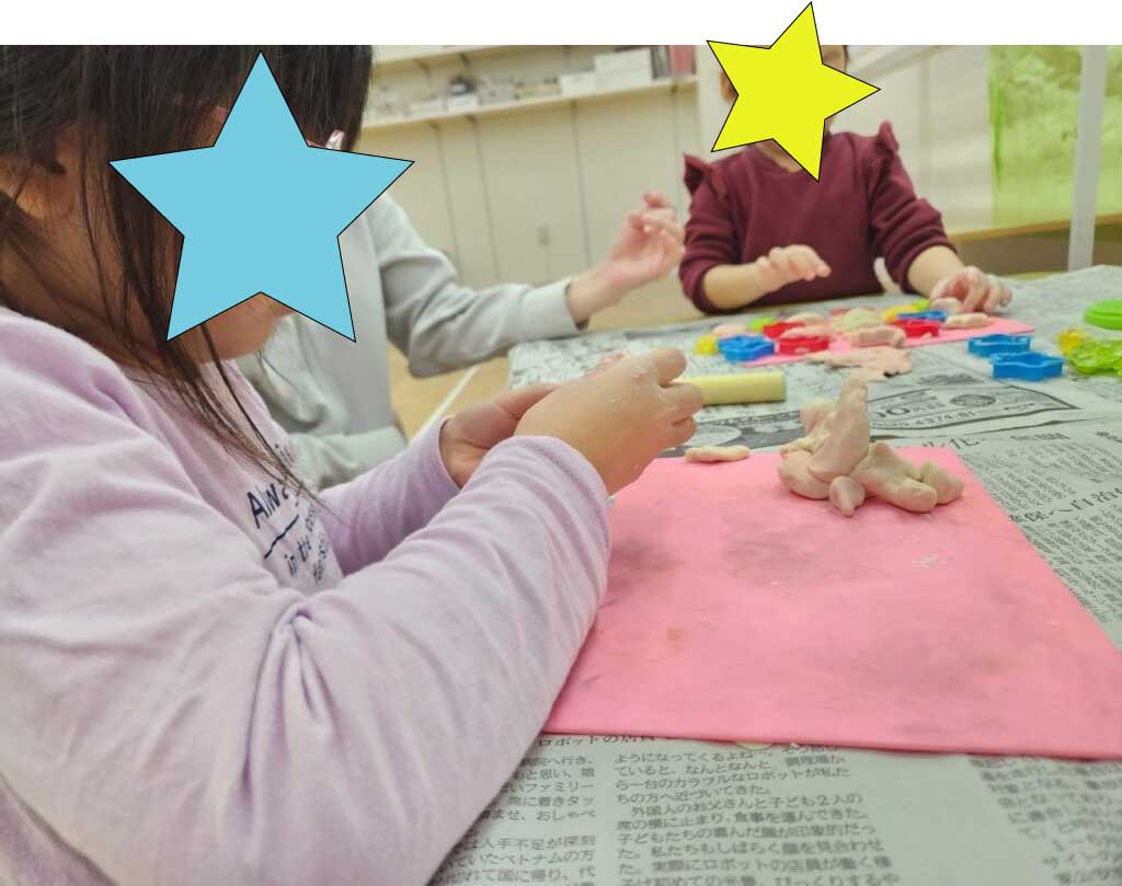 自由時間には小麦粘土に色を付けたり