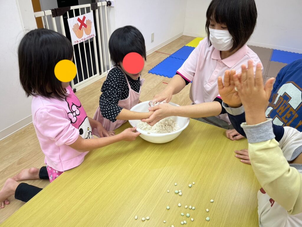 今日の課題は感覚遊びです!(^^)!小学生のみんなには小麦粉を水で調整して粘土作りからお手伝いしてもらいました♪