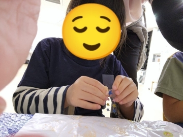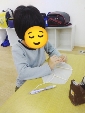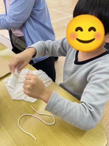 「学校でもつくったんだけど、また作るの〜?」「ビニール切りにくい!」って最初は嫌そうでしたが、さすが小学生!✨ヒモ通しとヒモ結びを難なくクリア✨