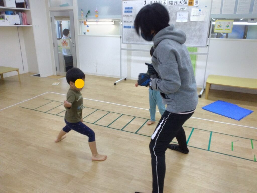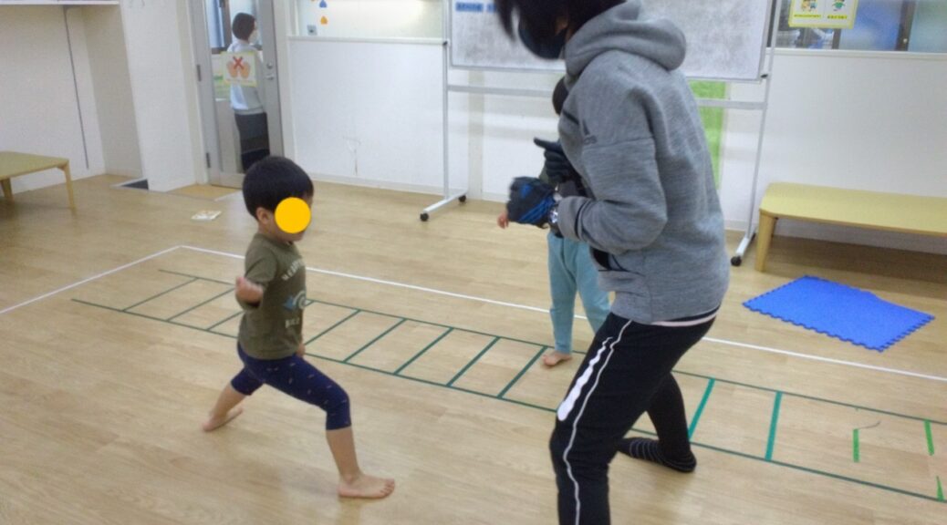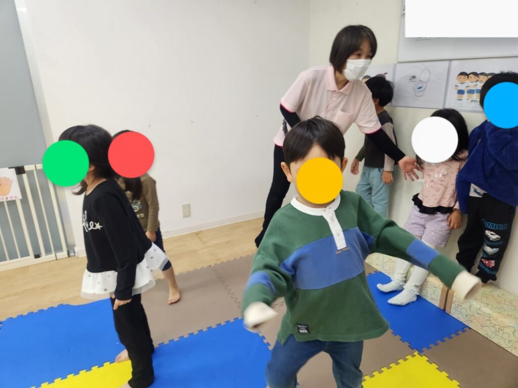 両足をピタッとつけて「グー」、両足を開いて「パー」、足を前後に開いて「チョキ」と声掛けしながら行いましたが、形を考えながら身体をその通りに動かす事に四苦八苦( *´艸`)それでも最後まで一生懸命取り組んでくれました☆