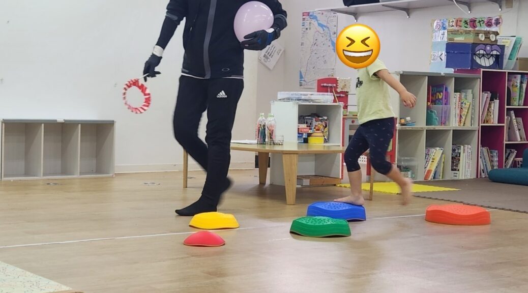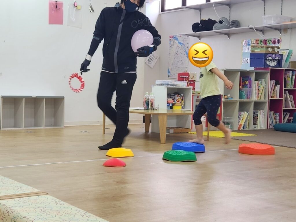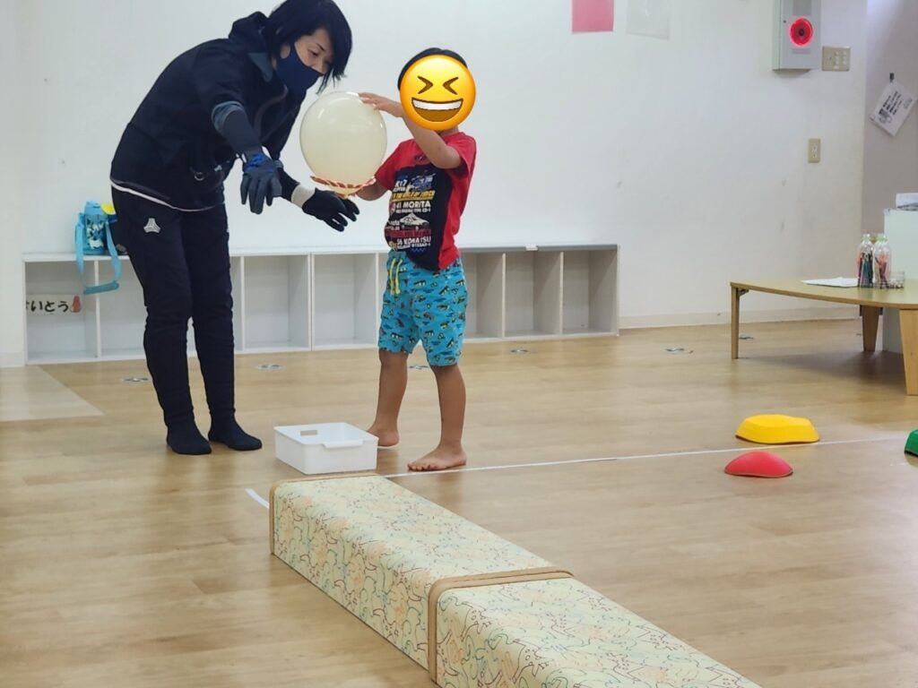 「風船遊び」から始めていきます!決められたコースの中で、風船を足に挟んで運んでみたり、