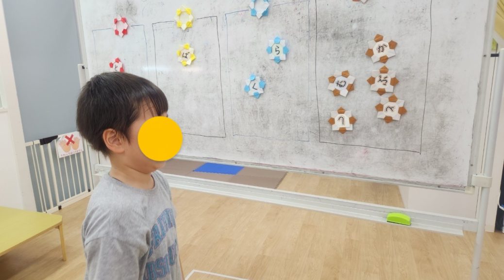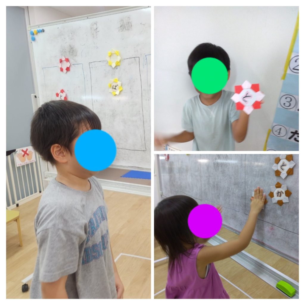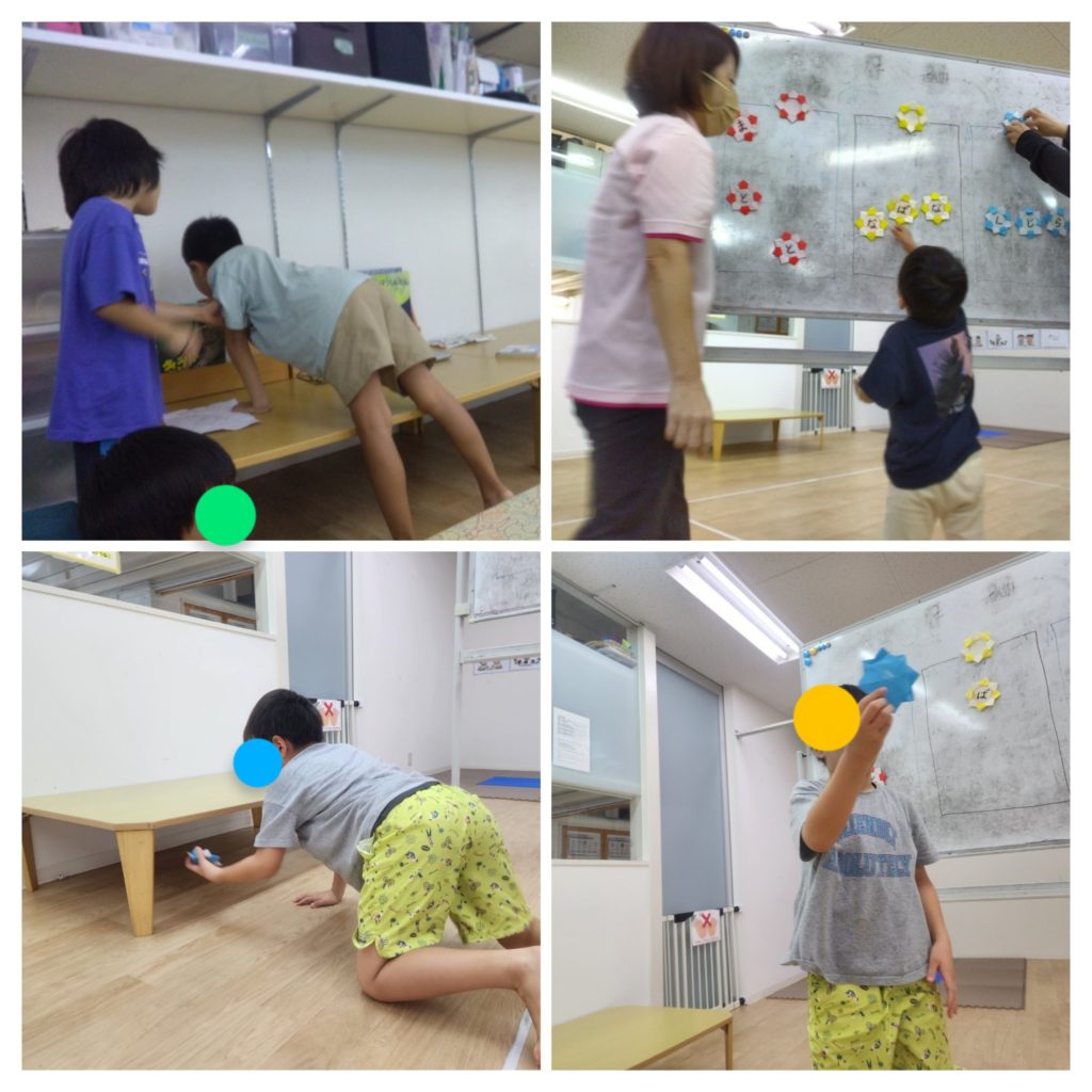 今日の課題は「宝さがし」。室内に隠された折り紙メダルを探し、メダルに書かれた文字を並べ変え単語を作るゲームに挑戦してもらいました(*^-^*)