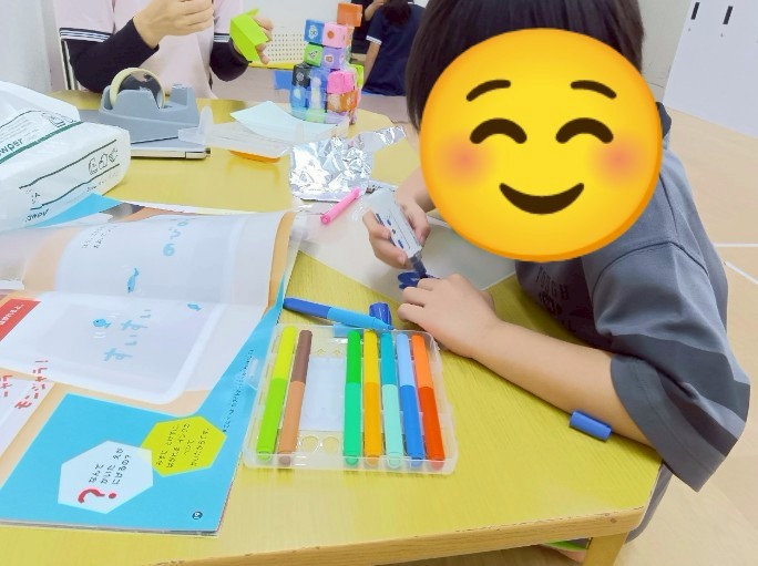 と、お話しながら、はさみでカットしたキャラクターを使って、お友達と「トントン相撲✋」を楽しむあろはキッズたちもいました😆
