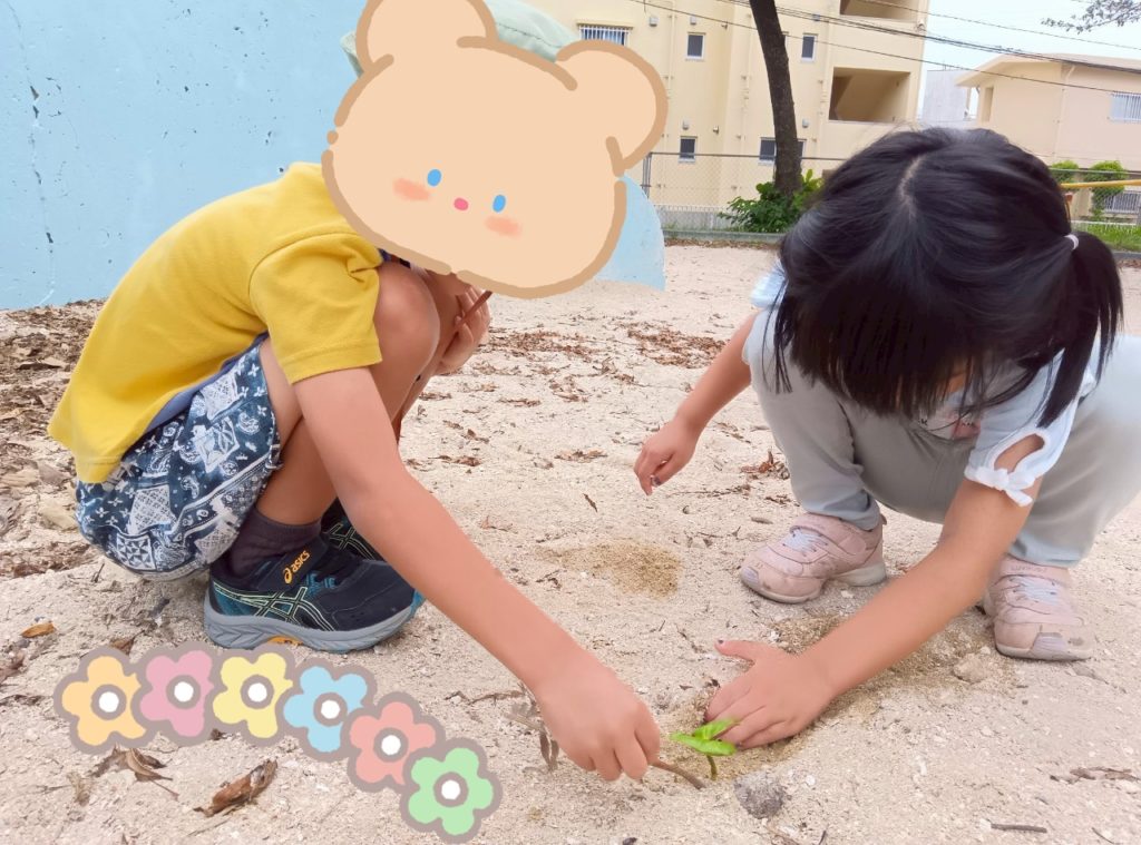 お友達と砂場に生えている草を見つけ💡観察したり🌱