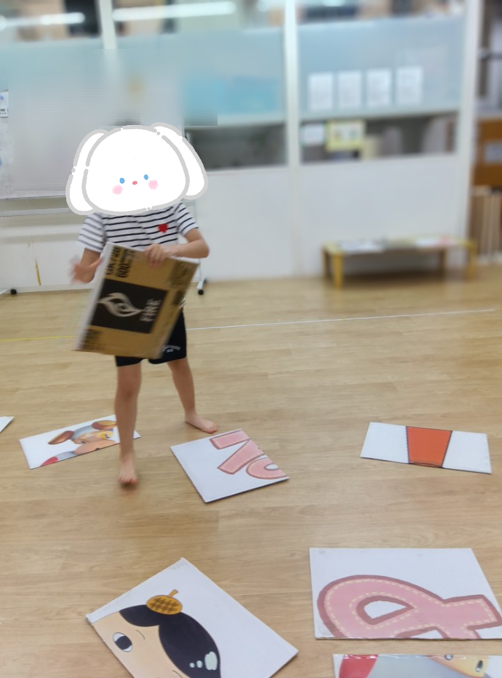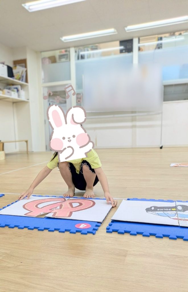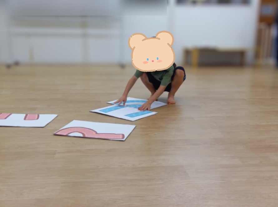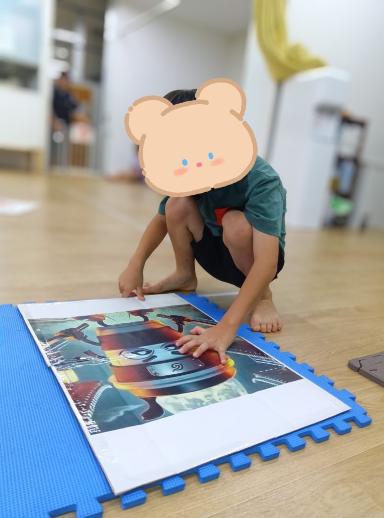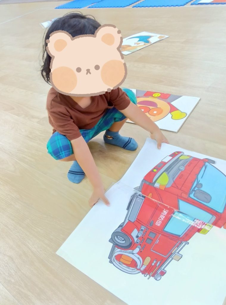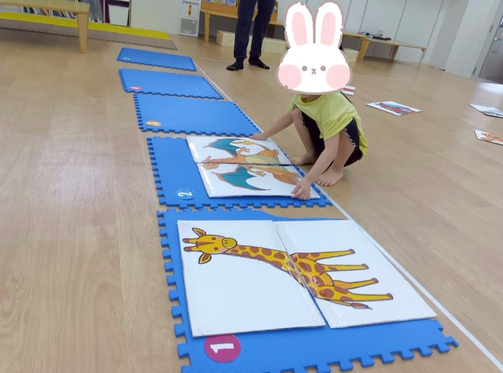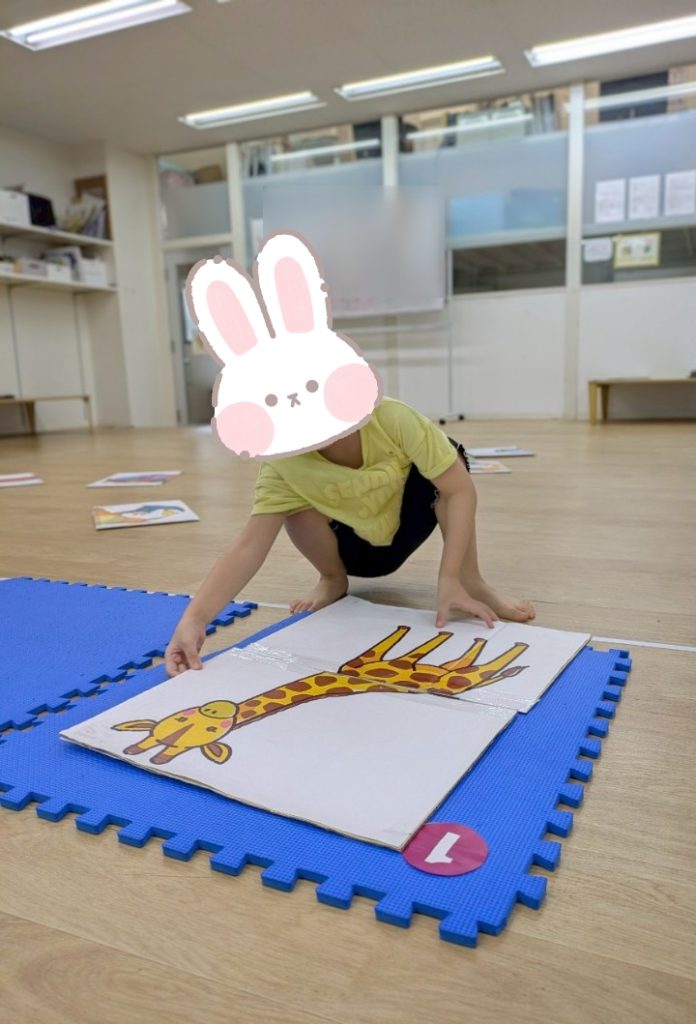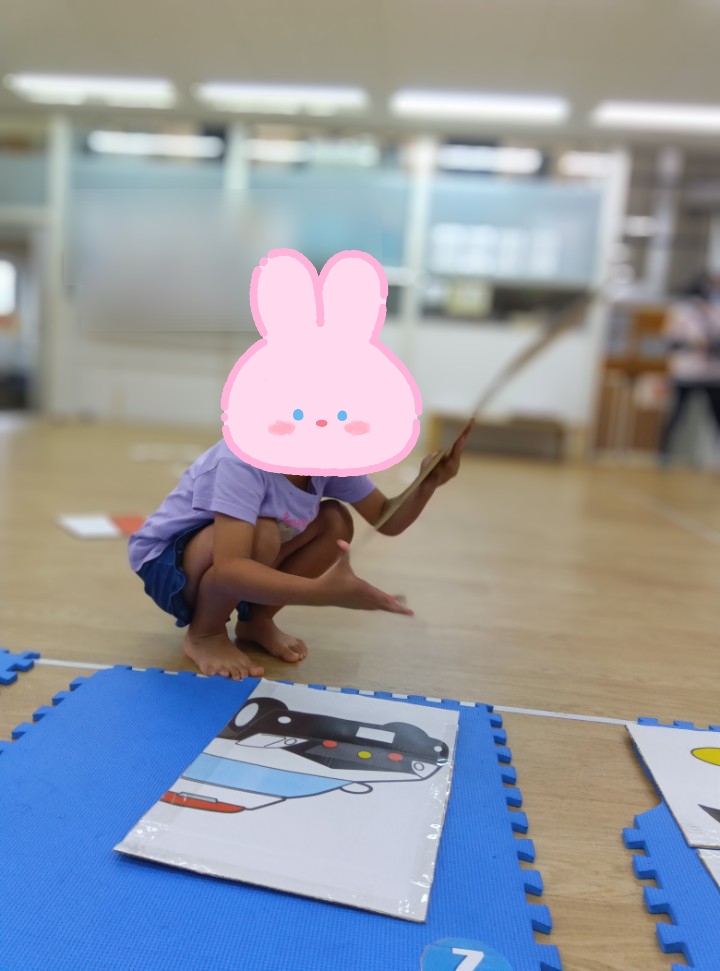 本日の課題は。。。みんな初挑戦!!?の絵かるたです🤗✨BIGサイズのかるたに子どもたちがだーいすきなキャラクターを貼り付けた絵かるたを準備しました😉✌️