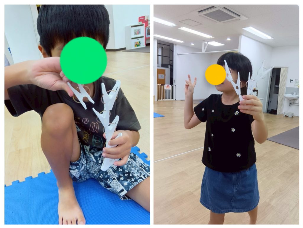 今日の課題は「せんたくばさみつまみ」です\(^o^)/手指の使い方や加減を知る目的で行いました♪