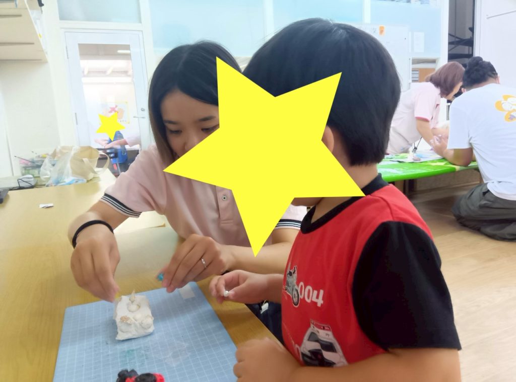 こうやるんだって〰️!!と適宜説明しながら、児童達が自分のセンスで飾り付け♪「ぶーぶー!」となんと大好きな車の形にしている子もいました🚘️