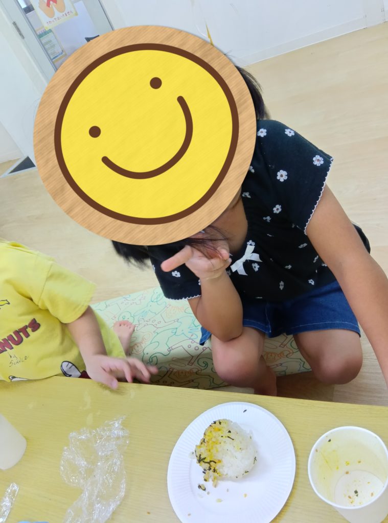完成!「美味しいおにぎりいただきます✨」皆自分で作ったおにぎりを美味しい美味しいとパクパク食べていました🤩