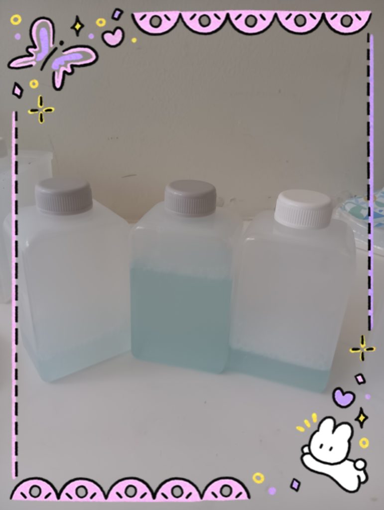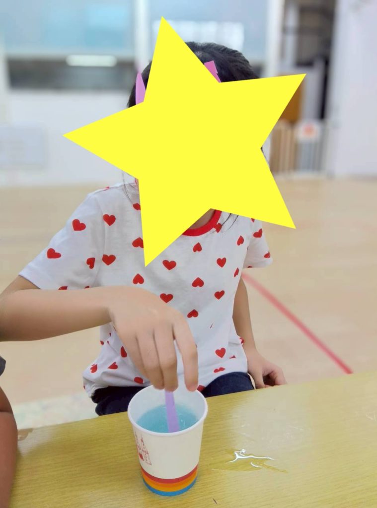材料と作り方の説明から。お水と中性洗剤とガムシロップでまぜまぜ〰️するんだよ、と説明😊