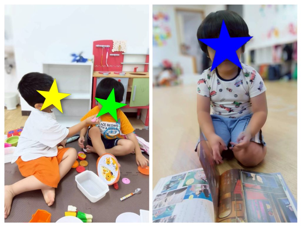おやつの後の自由時間には、ごっこ遊びでお友だちと関わったり、一人絵本に夢中になったりとそれぞれのゆったり時間を過ごしたあとは課題の時間です!