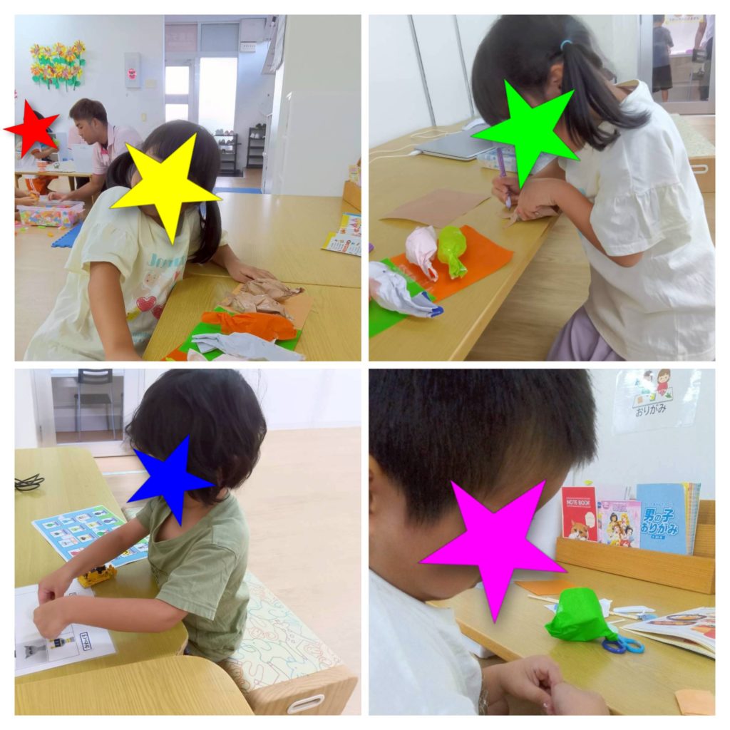 あろはKids小禄の児童は制作がと〜ても大好きで、自由時間には「折り紙したい!」「ペーパークラフトしたい!」とはさみやのり、テープなどの道具を使って手指を上手に楽しく動かしています(*^^*)どら焼きやクレープ、すしを作ったり、好きなキャラクターのイラストを切ってキャラクター一覧表を作ったりと楽しく作品を完成させてくれました♪