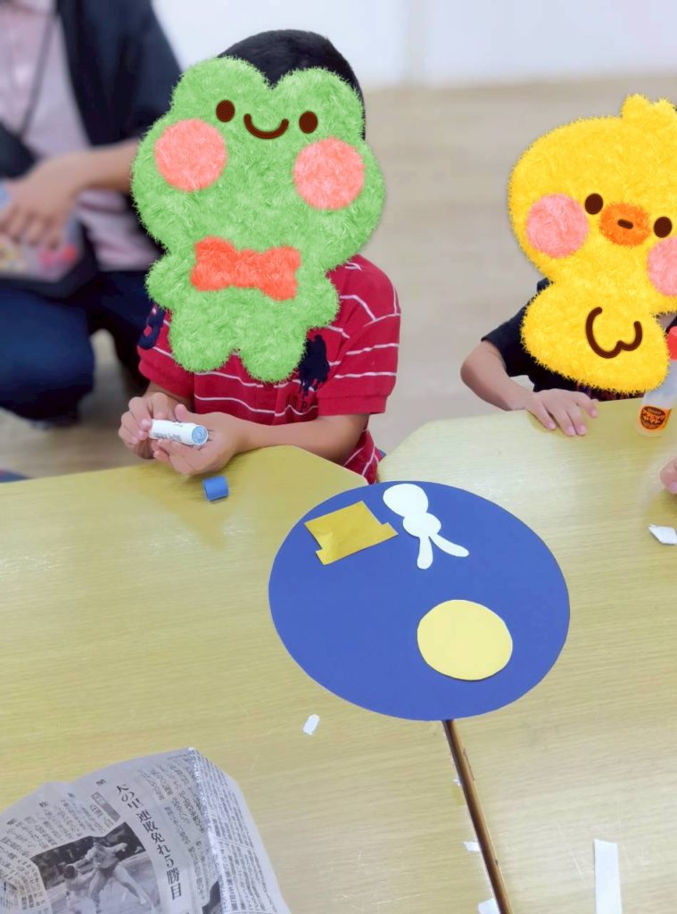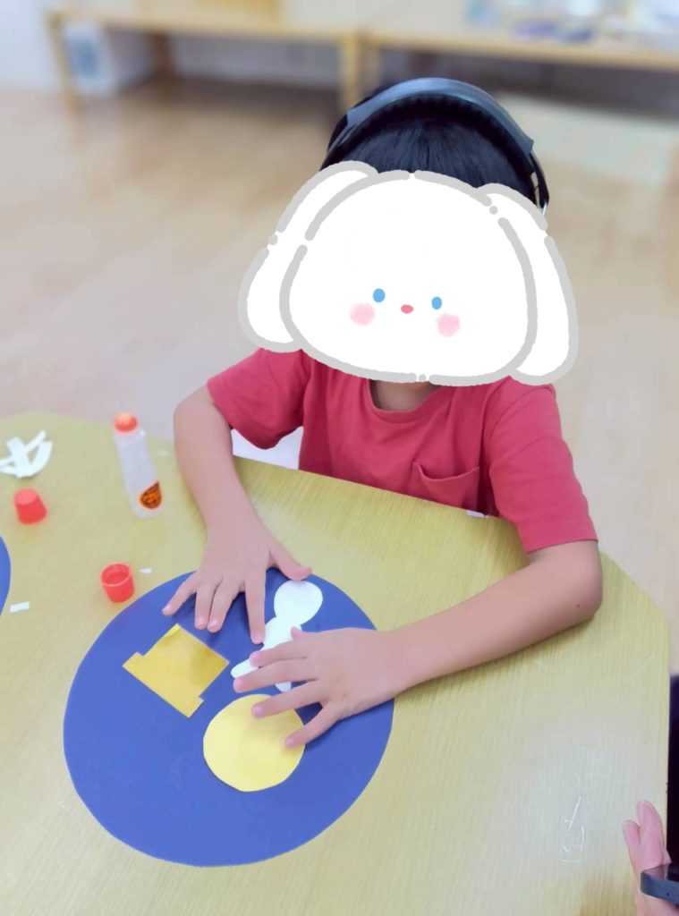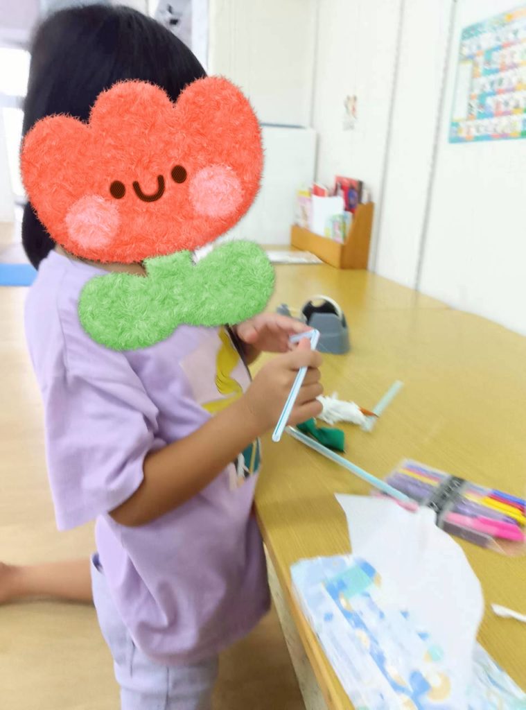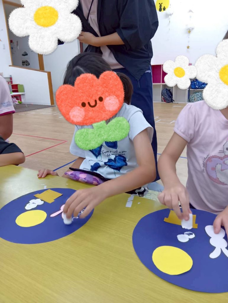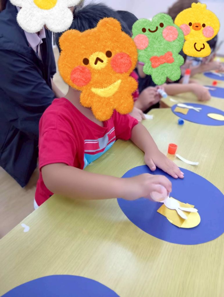 自由時間には、好きなキャラクターのイラストを切り取って画用紙に貼り付けて冠を作ったり、紙皿で好きな動物を作ったり、大好きなお友達にプレゼントするのー❤️と折り紙でペロペロキャンディーを作ったり🍭などなど、制作を楽しむKidsたちでした😉