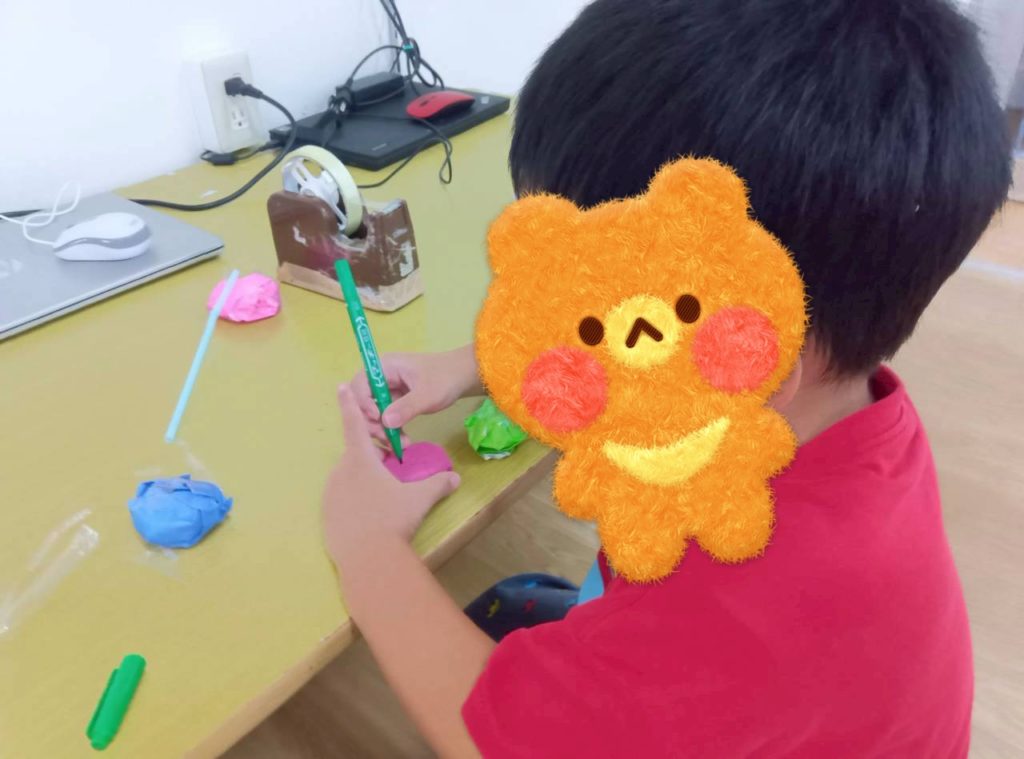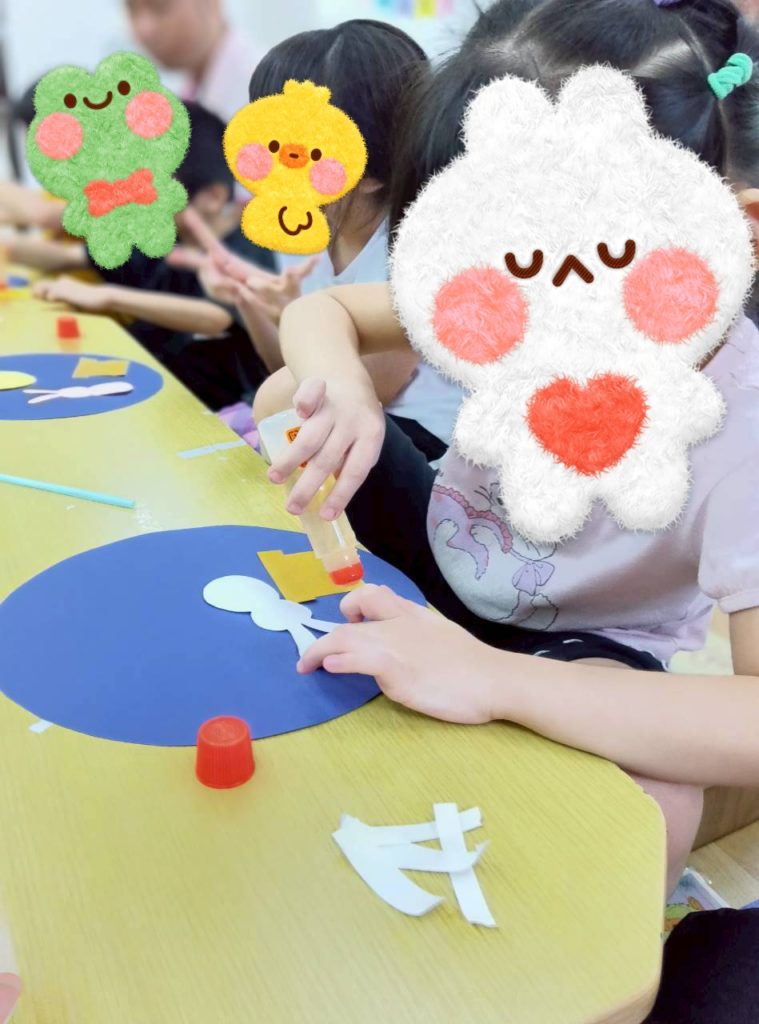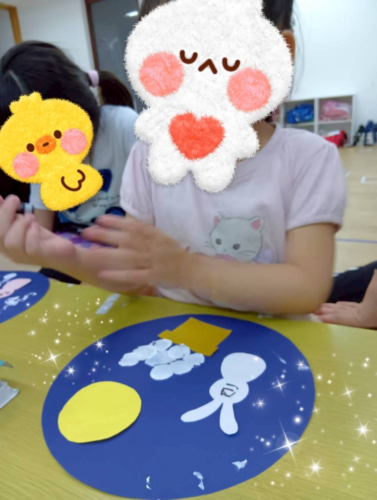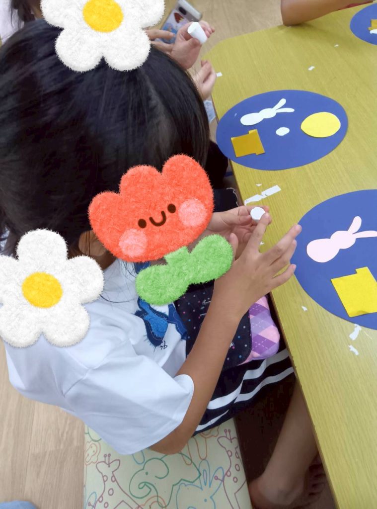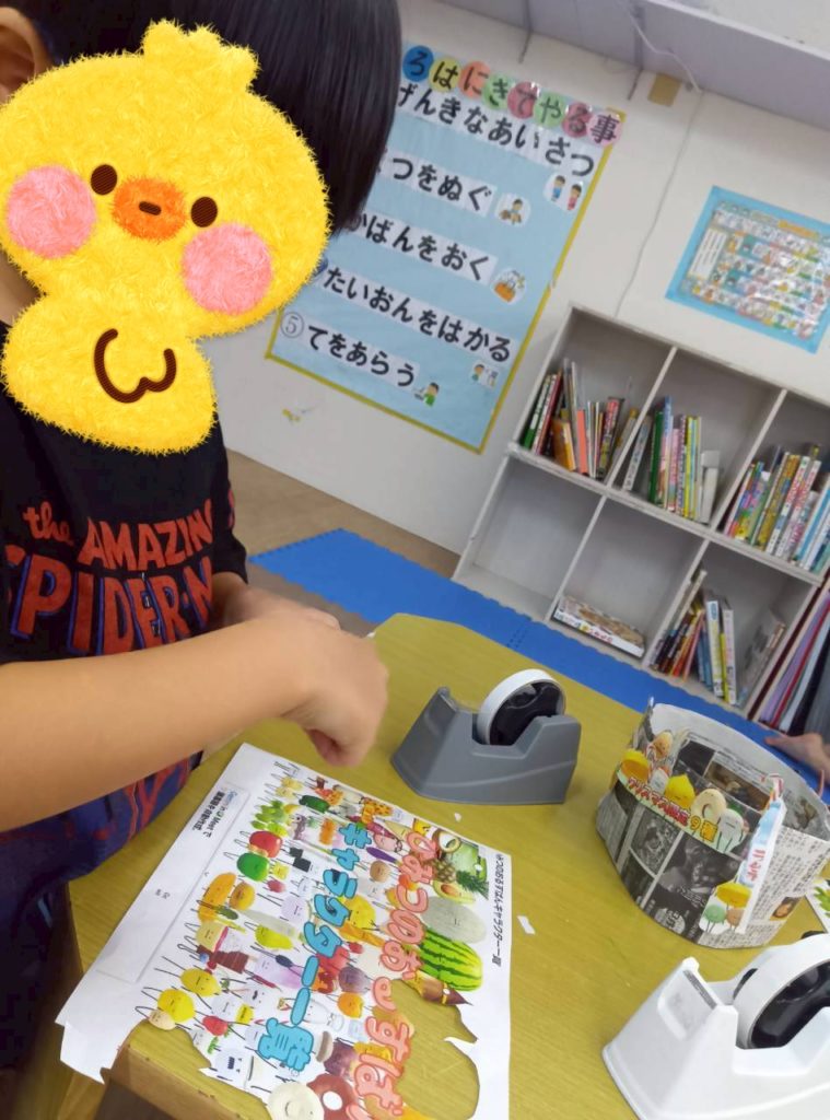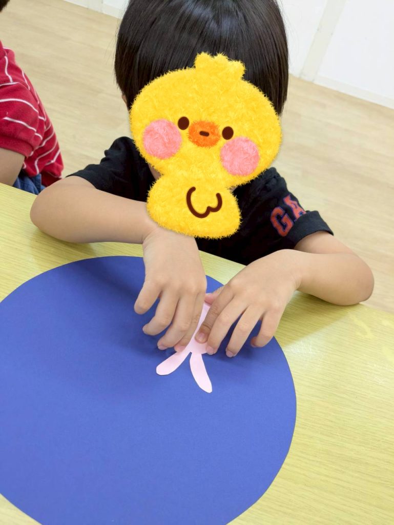 自由時間には、好きなキャラクターのイラストを切り取って画用紙に貼り付けて冠を作ったり、紙皿で好きな動物を作ったり、大好きなお友達にプレゼントするのー❤️と折り紙でペロペロキャンディーを作ったり🍭などなど、制作を楽しむKidsたちでした😉