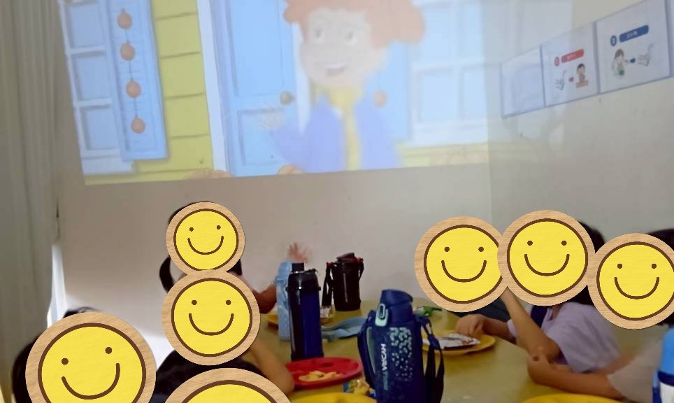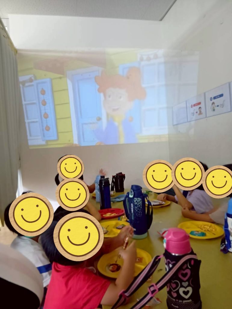 電気を消して少し暗くなると「映画館みたい」「ちょっと怖い」と口数が多くなる子供たち。