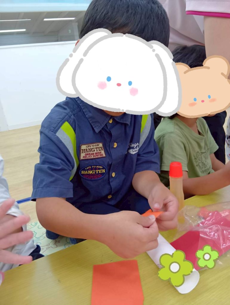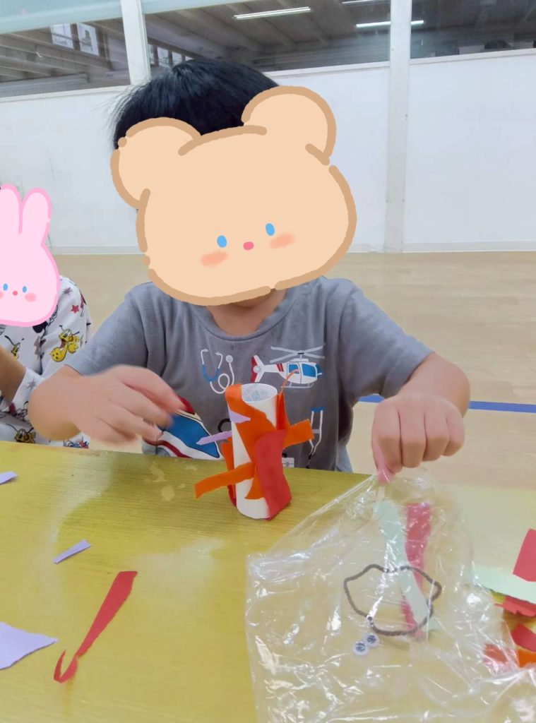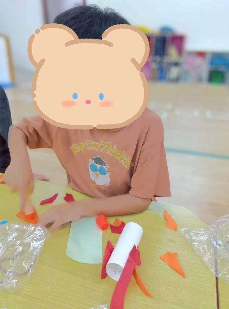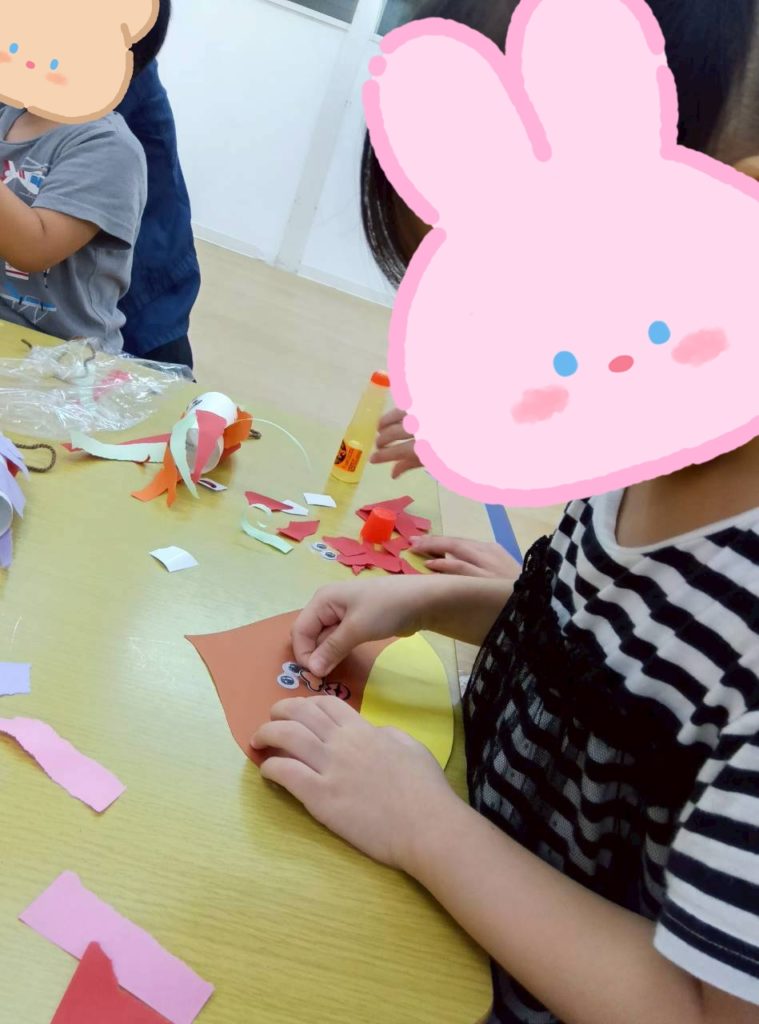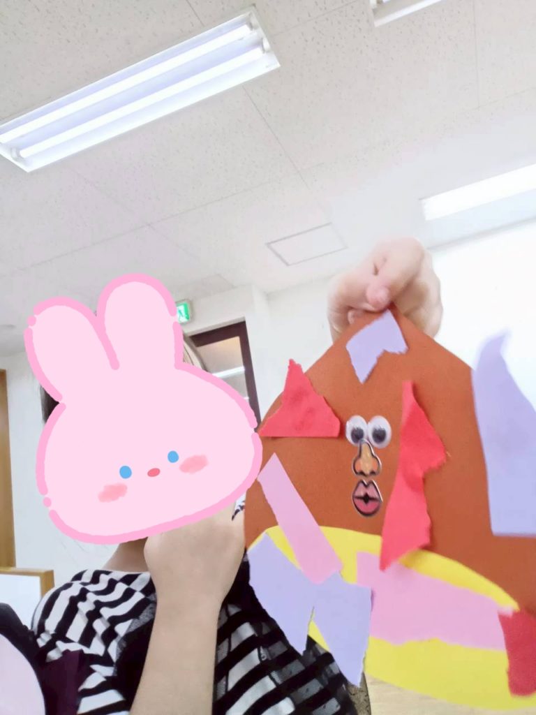 折り紙をちぎってペタペタペタペタ貼り付け、目ん玉シールを貼ったりペンで描き。。。お口をつけて。。。😃